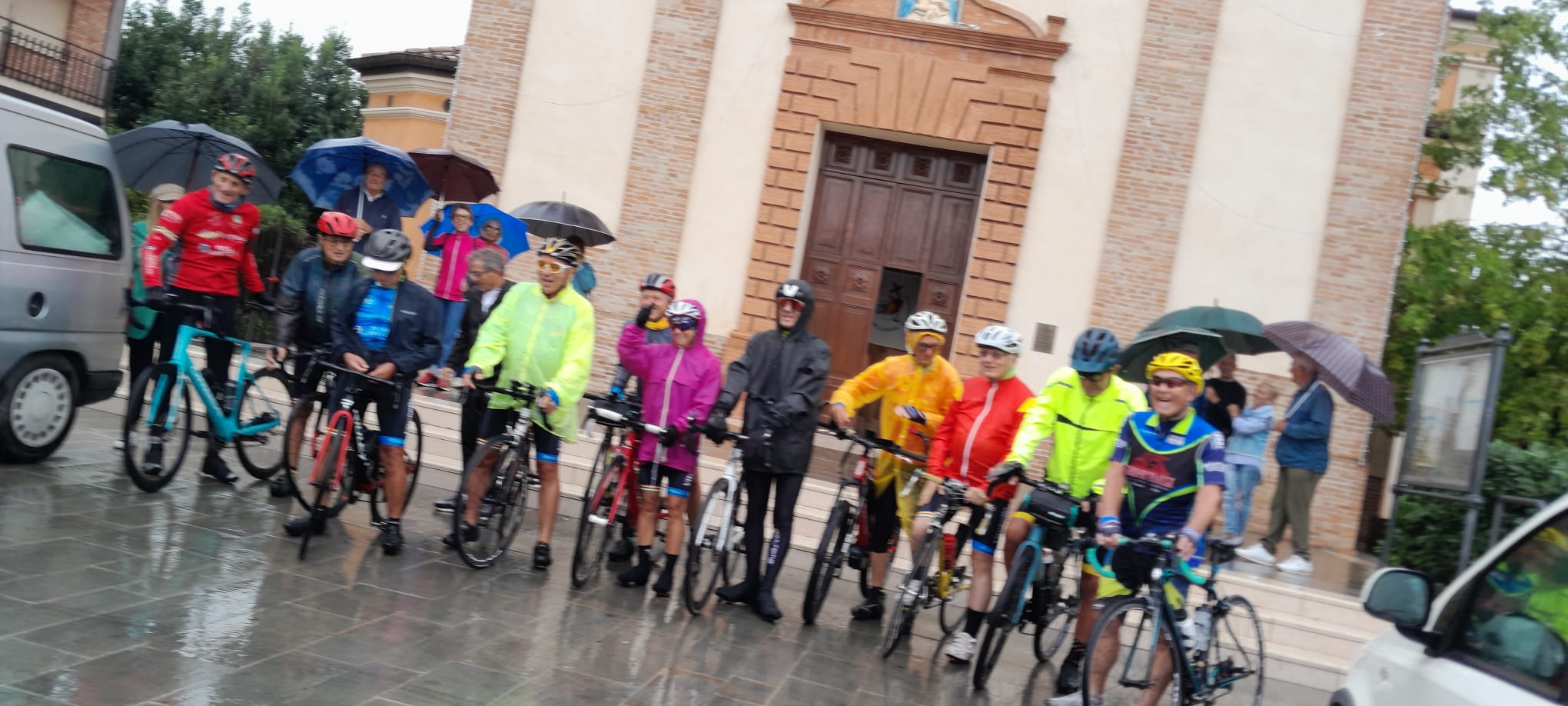 Pronti, colorati… e bagnati. Biciclette e caschetto, è iniziato questa mattina il pellegrinaggio in bici fino a Roma, promosso da un gruppo di dieci amici capitanati da don Sauro Bagnoli, parroco di Gambettola.