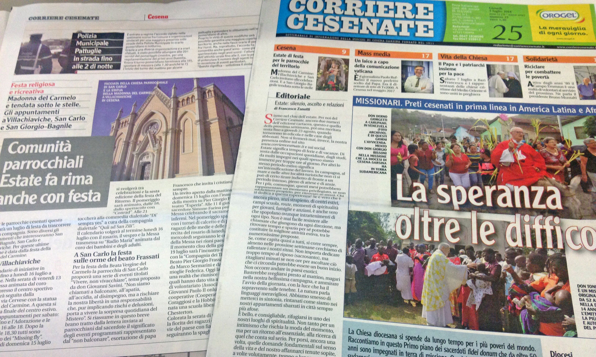 È già in edicola l’ultimo numero del Corriere Cesenate. Anche questa settimana sono tante le esclusive, a partire dal Primo piano: don Derno Giorgetti e don Giorgio Bissoni ci rendono protagonisti delle loro missioni in Venezuela, mentre padre Tonino Pasolini riferisce della sua avventura con Radio Pacis, da lui fondata in Uganda 14 anni fa.