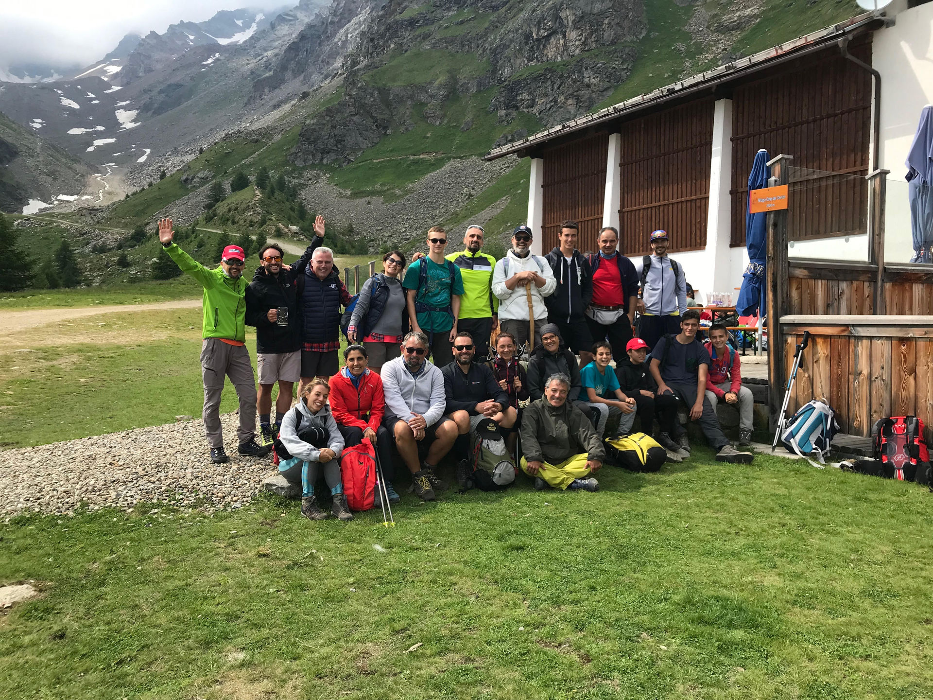 Qui sotto il gruppone dei 21 cesenati all’arrivo al rifugio Doss dei Cembri, al termine della slaita e della discesa al Vioz.