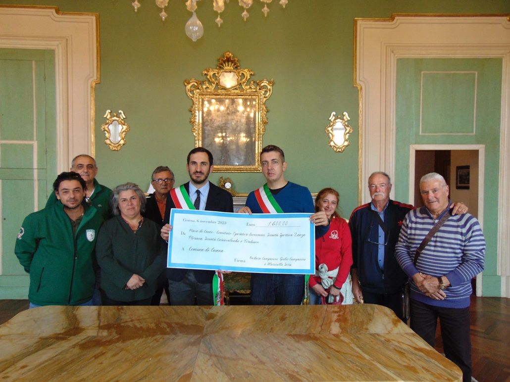 Questa mattina il sindaco Enzo Lattuca ha ricevuto in Comune, nella Sala degli specchi, il primo cittadino di Pieve di Cento, Luca Borsari, e i referenti della Società sportiva Lenza Floriana asd, delle società carnevalesche e Tirabuson e dei commercianti locali, che hanno donato al Comune di Cesena un assegno di 1600 euro raccolti durante la festa del 2 giugno.