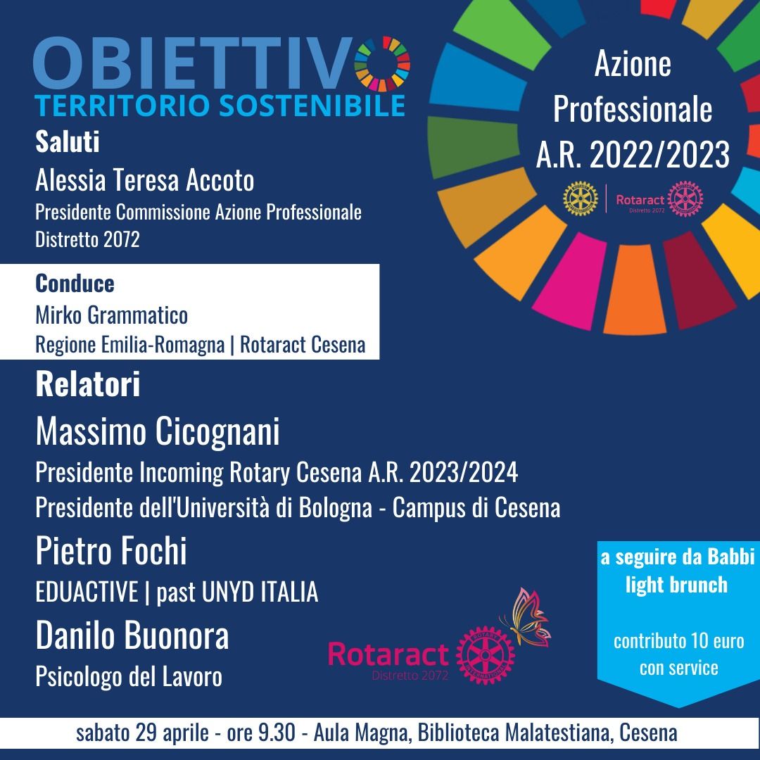 Si terrà sabato 29 aprile dalle 9,30 nell’Aula Magna della Biblioteca Malatestiana il convegno “Obiettivo territorio sostenibile”. VI parteciperanno: Massimo Cicognani, presidente dell’Università di Bologna – Campus di Cesena e presidente incoming del Rotary Cesena, Pietro Fochi, presidente di Eduactive e past Giovane delegato d’Italia alle Nazioni Unite, e Danilo Buonora, psicologo del lavoro. Lo rende noto il Rotaract zona Malatesta (corrispondente alle Provincie di Forlì-Cesena e Rimini) che organizza l’evento nell’ambito della sua Azione Professionale.