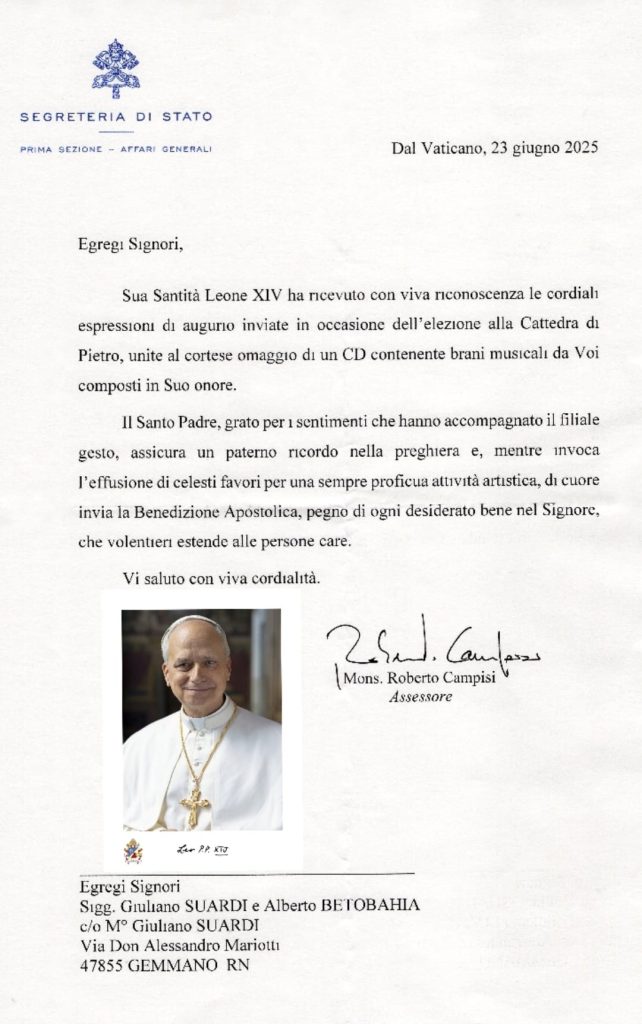 “Sua Santità Leone XIV – si legge nella lettera inviata dalla Segreteria di Stato del Vaticano, tramite monsignor Roberto Campisi, assessore della Santa Sede – ha ricevuto con viva riconoscenza le cordiali espressioni di augurio inviate in occasione dell’elezione alla Cattedra di Pietro, unite al cortese omaggio di un cd contenente brani musicali da voi composti in suo onore. Il Santo Padre, grato per i sentimenti che hanno accompagnato il filiale gesto, assicura un paterno ricordo nella preghiera e, mentre invoca l’effusione di celesti favori per una sempre proficua attività artistica, di cuore invia la benedizione apostolica, pegno di ogni desiderato bene nel Signore, che volentieri estende alle persone care”.
