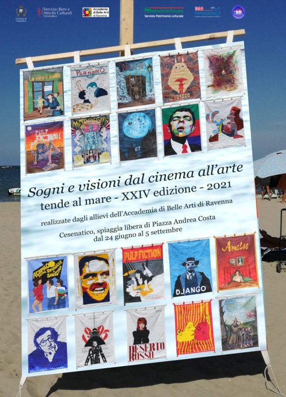Le “tende al mare” 2021 saranno dedicate al cinema, attraverso la rappresentazione di scene celebri, volti di attori famosi e manifesti di film divenuti iconici. Sono stati proprio i giovani allievi dell’Accademia di Belle Arti di Ravenna, guidati dalla loro docente e coordinatrice Paola Babini, a proporre questo tema che non era stato mai prima esplorato nelle precedenti edizioni delle “tende al mare”, a individuare i bozzetti e a realizzare poi le tende secondo la tecnica ormai sperimentata della pittura sulla tela.