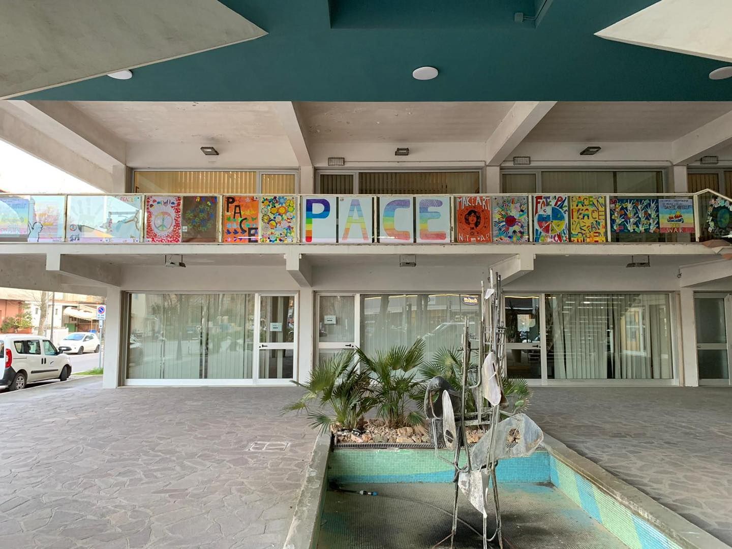 Gli alunni e i docenti della scuola media “Dante Arfelli” hanno colorato il Palazzo del Turismo di Cesenatico con disegni e cartelloni che inneggiano alla pace.