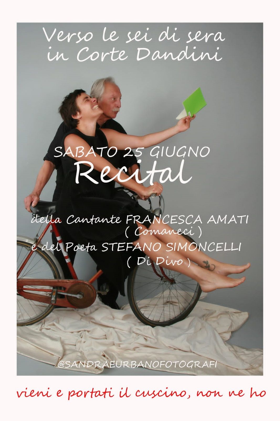 In corte Dandini, portandosi un cuscino da casa, si assisterà al duetto fra la cantante Francesca Amati e il poeta Stefano Simoncelli.