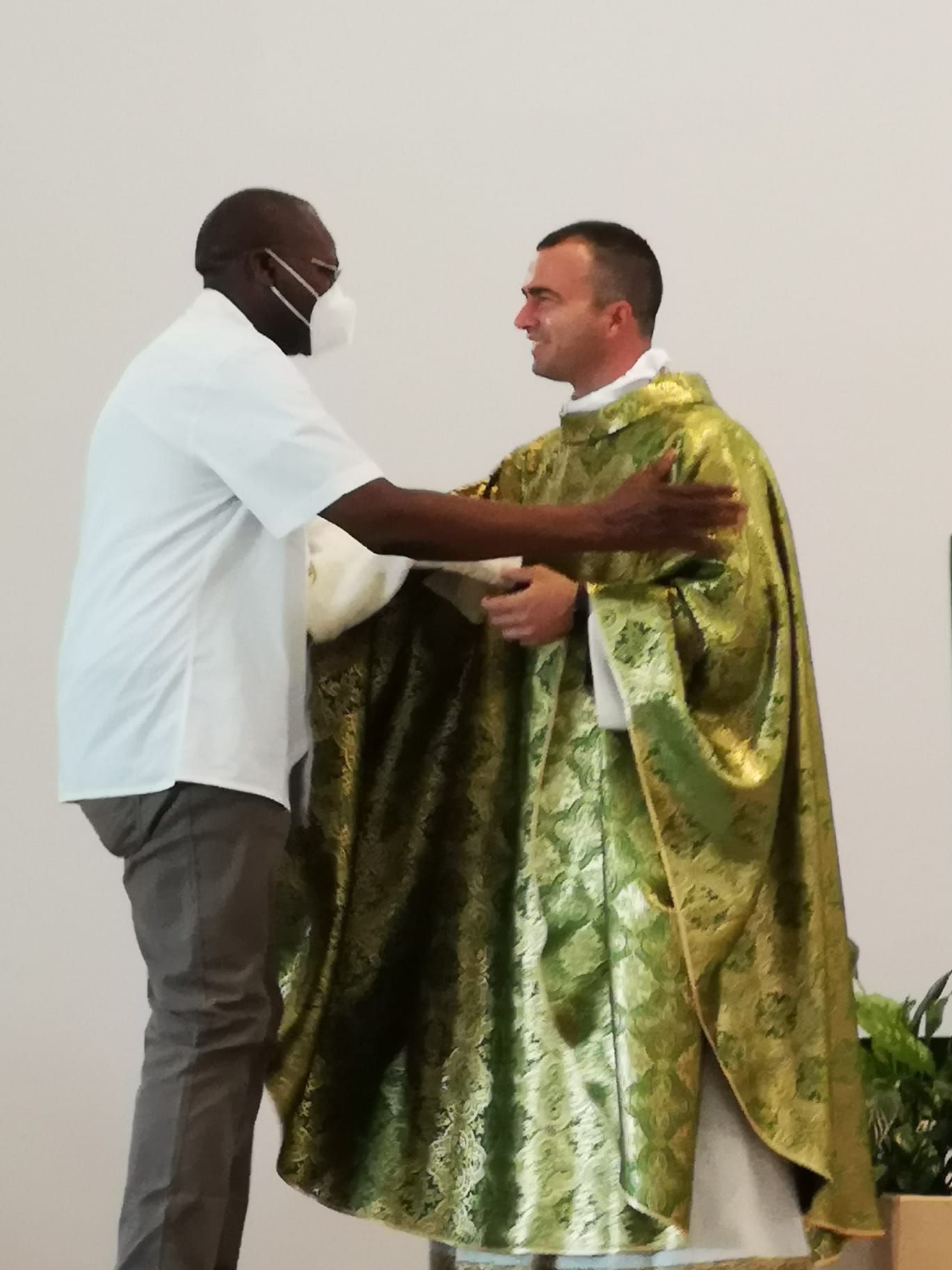 sono trascorsi oramai tre mesi dall’ingresso di don Fabio nella nostra comunità parrocchiale. Se con gioia ed emozione gli abbiamo dato il nostro benvenuto il 10 aprile scorso, oggi possiamo dire, con altrettanta gioia ed emozione, un grande grazie per il dono del sacerdozio, presente nella persona di Fabio.Se abbiamo pregato prima del suo arrivo chiedendo al Signore ti tenerlo vicino a Lui, al vescovo, ai suoi confratelli e alla nostra comunità oggi tocchiamo con mano questa vicinanza: nella celebrazione eucaristica, che il don prepara con grande cura, spezzando il pane della Parola per le nostre vite, nell’accompagnamento ai più piccoli (in particolare a coloro che hanno ricevuto Gesù per la prima comunione), nei primi lavori intorno alla Parrocchia che hanno coinvolto i ragazzi, nel sostegno ai giovani che si stanno impegnando ad animare il Grest in queste settimane e nella presenza discreta e attenta per le famiglie della comunità.E’ bello vedere il don che gioca in mezzo ai nostri figli, che prende in mano i problemi, che mette in moto nuove relazioni, che ci porta in camminata, che non perde occasione per stare in mezzo a noi con il suo modo gentile e pronto all’ascolto, che cerca di tendere la mano ai poveri che si rivolgono a lui. Quanto è prezioso questo suo esserci! Continueremo a pregare per don Fabio e gli chiediamo di fare altrettanto per noi, nella consapevolezza che questa vicinanza è un dono da preservare e da tenere vivo ogni giorno. E ringraziamo Lei Eccellenza, perché in questi mesi non ha mai fatto mancare la sua presenza e ci ha dimostrato tutta la sua attenzione, durante la visita pastorale e confermandola in questa celebrazione eucaristica. Qualche giorno fa Papa Francesco rivolgendosi a un gruppo di sacerdoti e vescovi ha detto: “Noi non conosciamo nemmeno noi stessi, ma se torniamo alla chiamata, non possiamo ignorare quel Volto che ci ha incontrati e tratti dietro di sé, persino uniti a sé, come la nostra tradizione insegna quando afferma che nella liturgia agiamo addirittura “in persona Christi”. Questa unità piena, questa identificazione non possiamo limitarla alla celebrazione, bensì occorre viverla pienamente in ogni istante della vita, memori delle parole dell’apostolo Paolo: “Non vivo più io, ma Cristo vive in me” (Gal 2,20).Ti auguriamo di vivere sempre questa unità piena, don Fabio“.