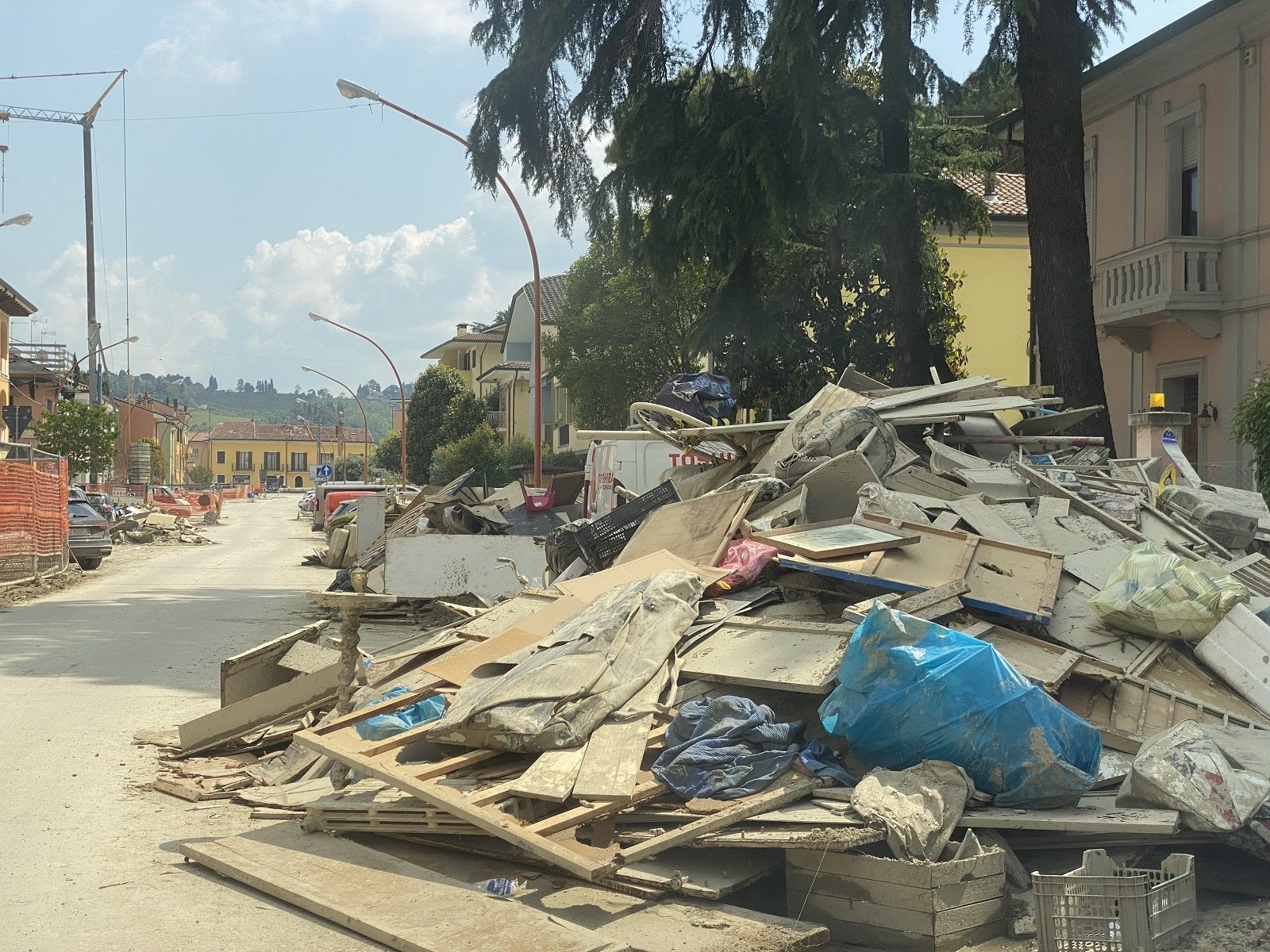 Il sole ha trasformato il fango in una crosta simile al cemento. Si sfiorano i 28 gradi. Fa caldo e ovunque, nelle vie travolte dall’acqua, la polvere si alza al passaggio dei mezzi. Pare di essere sulle strade polverose dell’Africa. Si incrociano ancora tanti della Protezione civile e dei Vigili del fuoco giunti da diverse regioni. Lungo le strade si ammassano divani, armadi, letti, materassi, anche se durante la notte i 30 mezzi resi disponibili dal Comune hanno liberato i marciapiedi. (Nella foto sotto un tratto di via Gramsci, oggi)