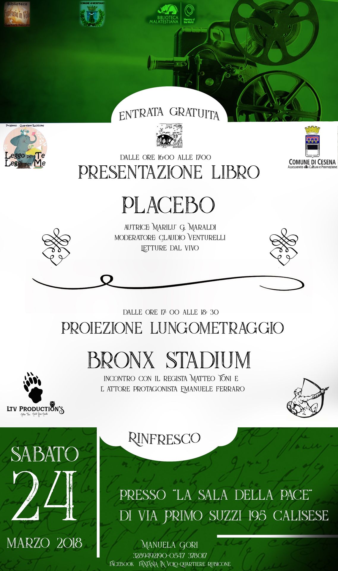 Avrà luogo dalle 16 di sabato prossimo 24 marzo presso la Sala per la Pace del Quartiere Rubicone, in via Primo Suzzi, 195, a Calisese, la presentazione di “Placebo” e “Bronx stadium”.