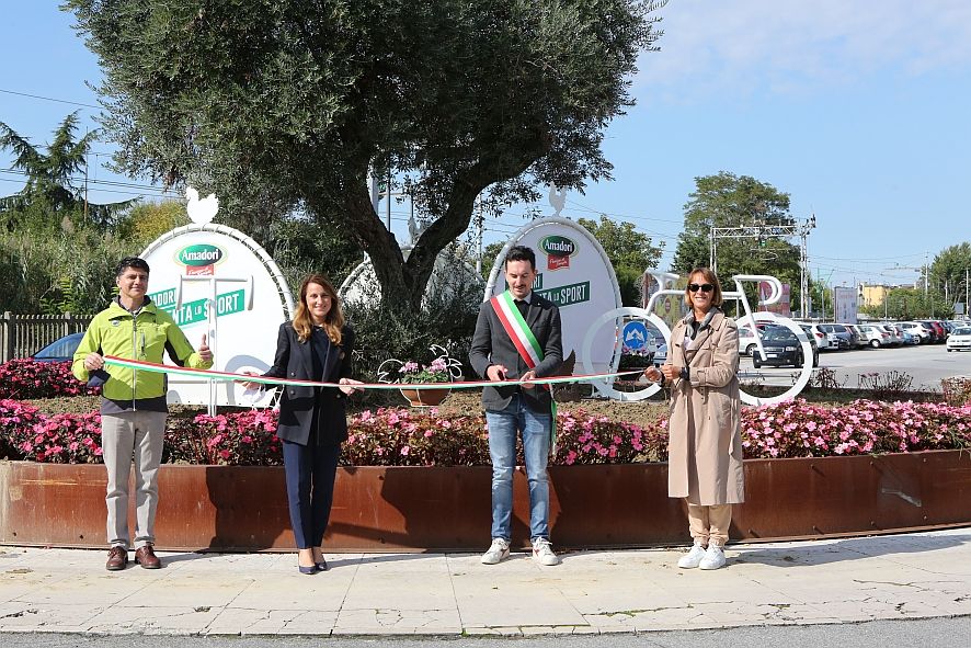Al termine dell’evento, sindaco e assessore, assieme allo staff della “Fausto Coppi” e a Francesca Amadori hanno inaugurato le nuove installazioni in rosa, a cura dell’azienda Amadori, nella rotonda di via Cecchini, uno degli ingressi in città.