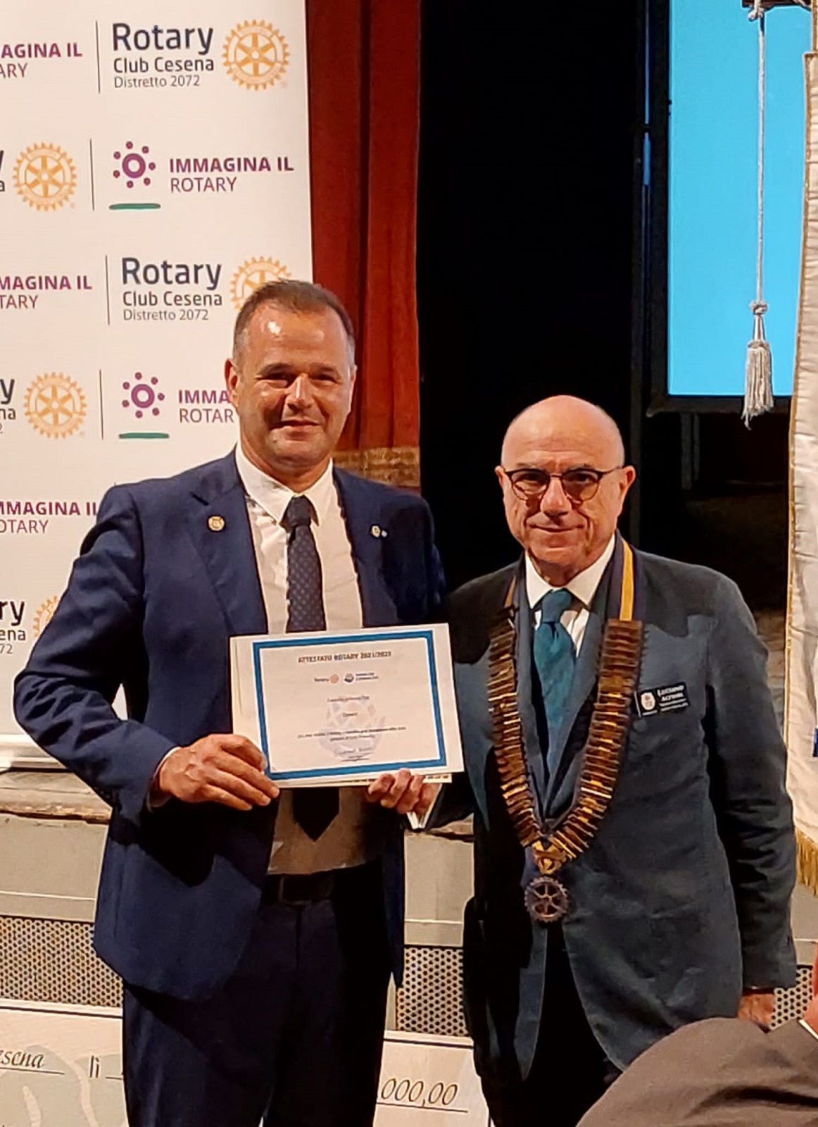 Nella foto di Alessio Avenanti, il governatore Luciano Alfieri consegna al presidente dell’annata 2021-2022 Rocco De Lucia l’attestato del presidente internazionale per aver raggiunto tutti gli obiettivi dell’annata.