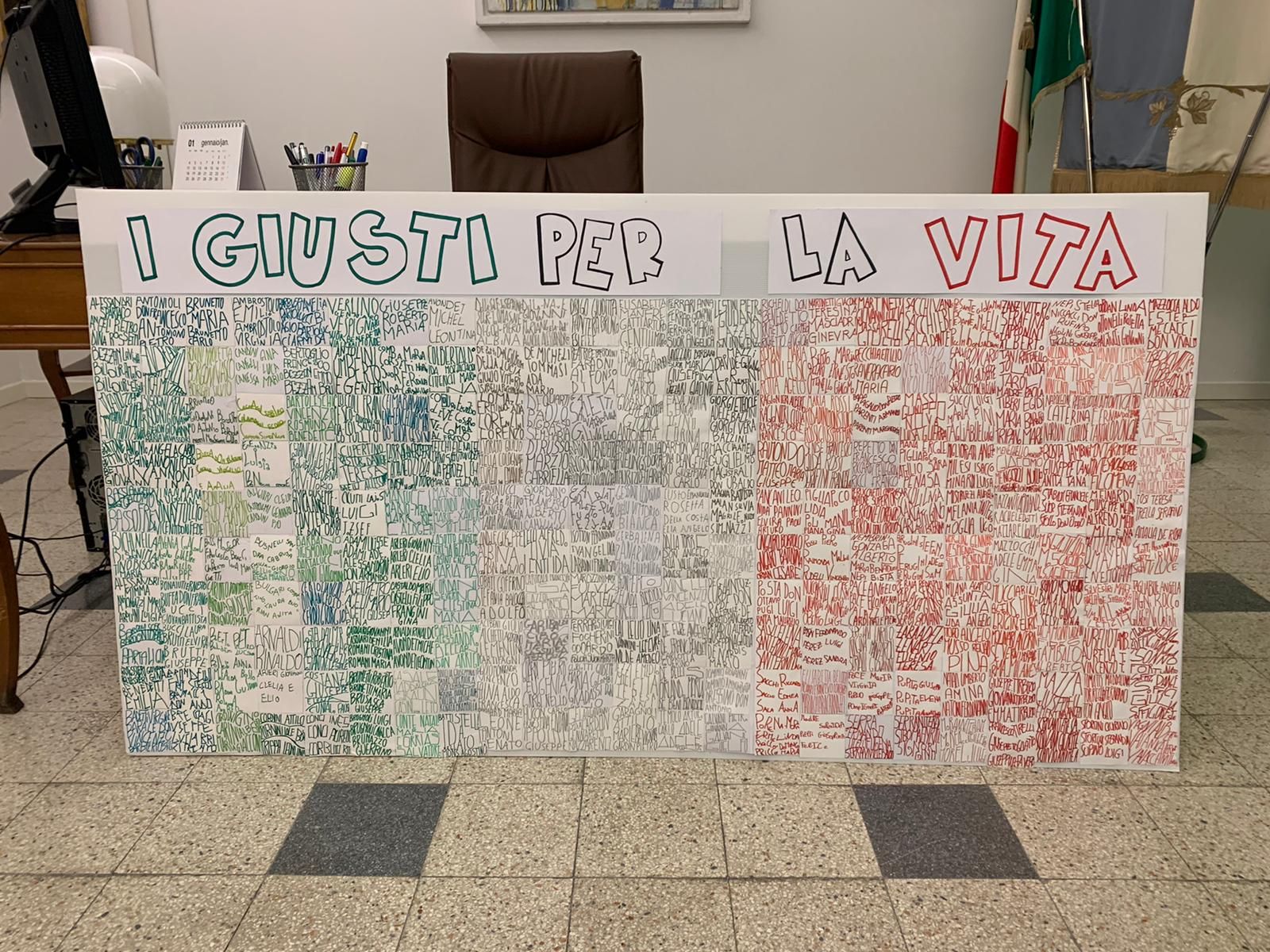 Il progetto ha visto protagonisti i giovani studenti delle sette classi della scuola media che hanno adottato simbolicamente alcuni Giusti e hanno poi trascritto i rispettivi nomi in verde e rosso su altrettanti cartoncini che sono andati a formare la grande bandiera italiana. La bandiera, realizzata in tre copie, sventolerà davanti all’ingresso delle due scuole e del Municipio.