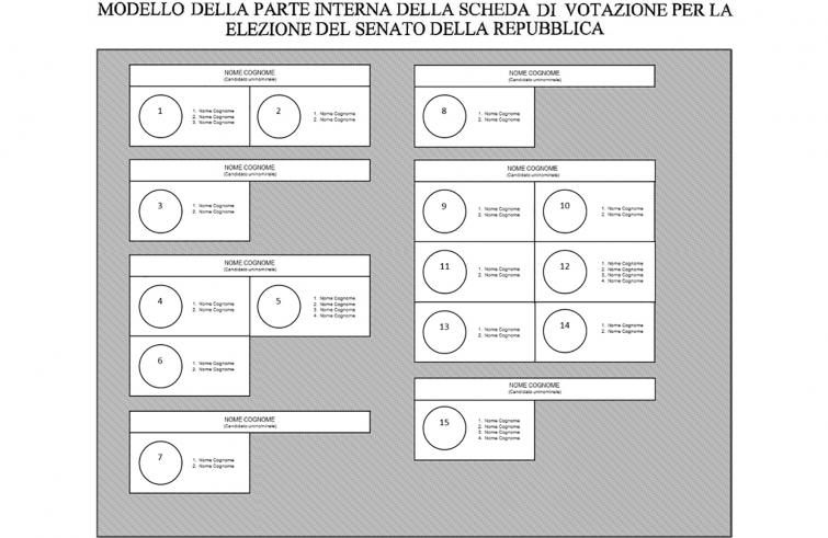 Come si presenta la scheda elettorale?Sulla scheda compaiono i nomi dei candidati nel collegio uninominale e subito sotto il simbolo o i simboli dei partiti ad essi collegati. A fianco di ciascun simbolo è riportata una mini-lista con i candidati che corrono per i seggi assegnati con il metodo proporzionale. Simbolo e lista sono contenuti in un riquadro. Così, sotto il riquadro del candidato uninominale, gli elettori troveranno tanti riquadri quanti sono i partiti che sostengono quel candidato.