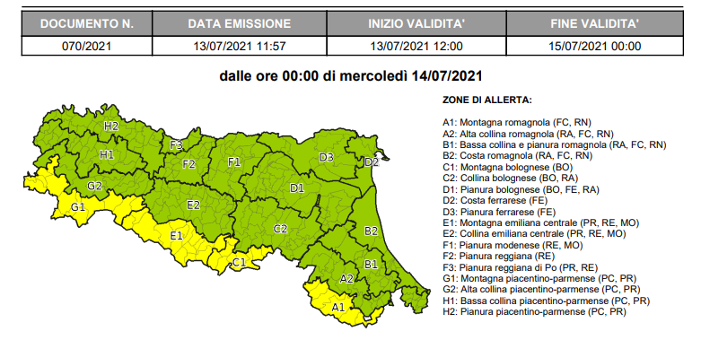 Per la giornata di domani, mercoledì 14 luglio, sono previste ancora condizioni di instabilità, in particolare lungo i rilievi e sulla pianura occidentale della regione a cui potranno essere associati fenomeni temporaleschi sparsi. La ventilazione da sud-ovest si prevede con venti di burrasca lungo la fascia appenninica e non si escludono temporanei rinforzi o raffiche di intensità superiore. Migliora sulla pianura romagnola.