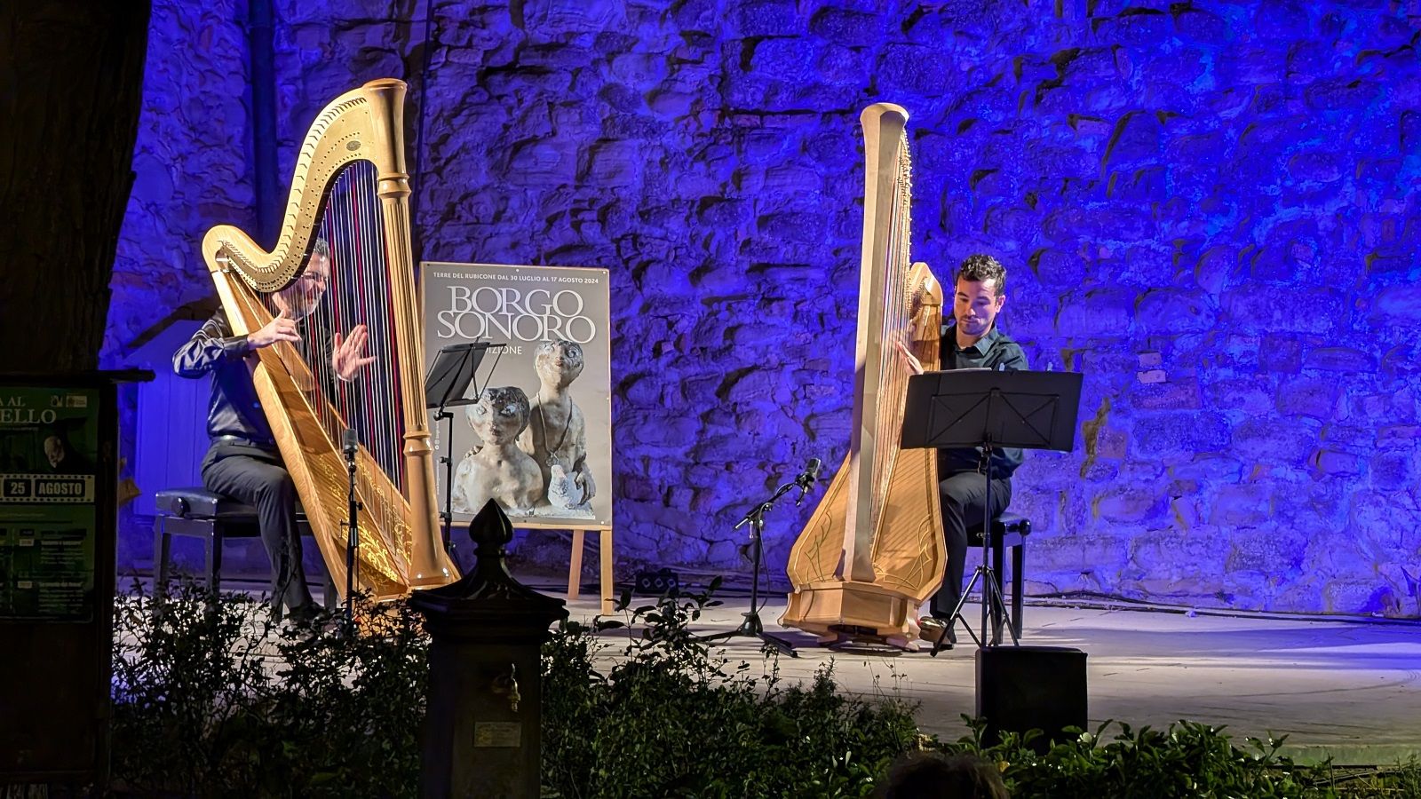 Per i due arpisti si è trattato di un gradito ritorno a Borgo Sonoro, dove in passato si sono esibiti con un diverso programma musicale. Davide Burani, modenese, è titolare della cattedra di arpa al Conservatorio ‘Peri-Merulo’ di Reggio Emilia e Castelnovo ne’ Monti ed è prima arpa della Filarmonica dell’opera italiana Bruno Bartoletti (ex Orchestra del Teatro Regio di Parma); mentre José Antonio Domené, uno dei più talentuosi arpisti spagnolo, è prima arpa della Filarmonica di Oviedo.
