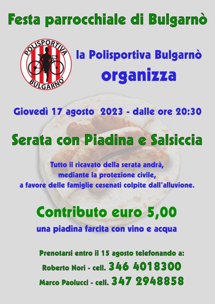Un’altra serata di solidarietà è stata organizzata per il giorno precedente, giovedì 17 agosto. Dalle 20,30 sarà possibile cenare a base di piadina e salsiccia con un contributo di 5 euro. La serata è promossa dalla locale Polisportiva.