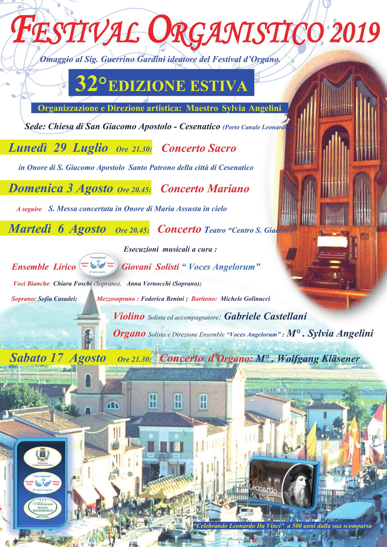 Al via l’edizione estiva del Festival organistico di Cesenatico, presso la chiesa di San Giacomo apostolo, sul porto canale. L’organizzazione e la direzione artistica sono del maestro Sylvia Angelini. Con questa 32esima edizione, patrocinata dal Comune di Cesenatico, si vuole rendere omaggio a Guerrino Gardini, ideatore del Festival.