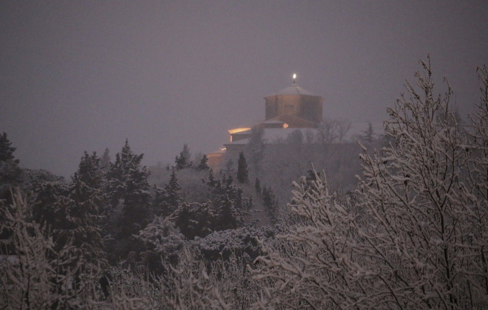 La basilica del Monte sotto la neve. Foto di Pier Giorgio Marini