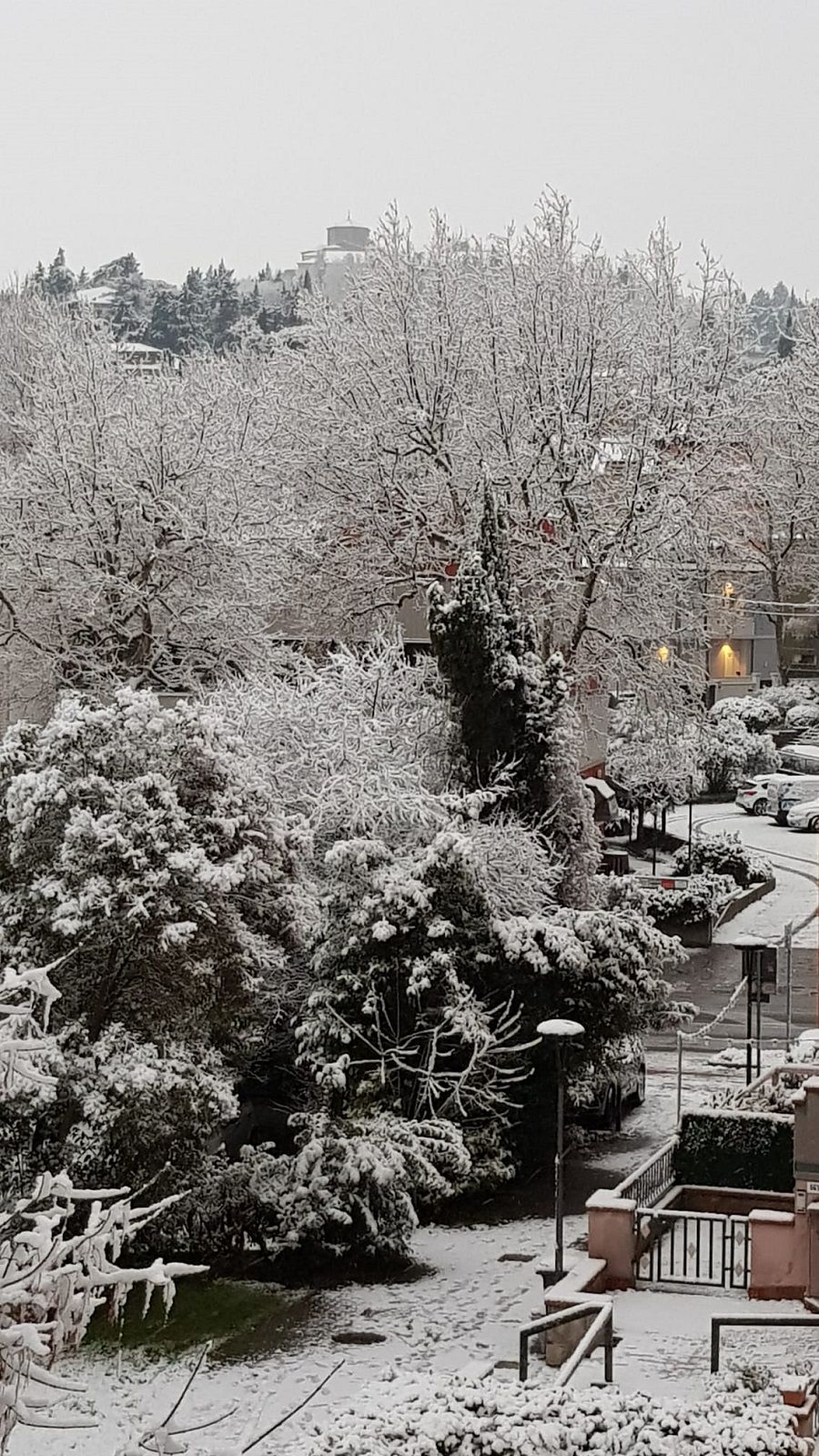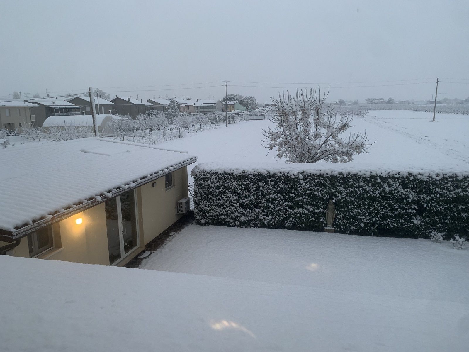 Anche nella pianura, i fiocchi caduti si sono accumulati per alcuni centimetri. Le strade ancora non sono state pulite dai mezzi spazzaneve.