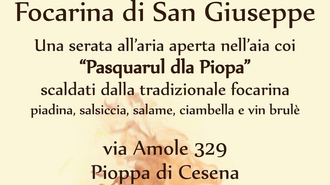 Una serata nell’aia, organizzata dall’associazione Valori e Libertà, scaldati dalla tradizionale focarina, con i Pasquarul dla Piopa, vin brulè, salsiccia, piadina e ciambella. Il ricavato sosterrà attività per i malati di Parkinson.Dopo il successo dello scorso anno, l’associazione Valori e Libertà replica l’appuntamento con la focarina di San Giuseppe. Da sempre nella mission dell’Associazione Valori e Libertà di Cesena rientra la valorizzazione del territorio e delle sue tradizioni. La focarina di San Giuseppe è sicuramente una celebrazione tipica del folclore romagnolo. Dopo l’avvento del cristianesimo è dedicata a San Giuseppe ma affonda le sue radici in epoca pagana. La data è la vigilia dell’equinozio di primavera, periodo di riti per propiziare la fertilità nonché l’inizio del nuovo anno romano.