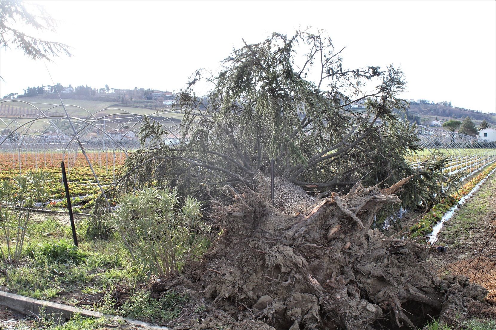 In via Cesena, fra Calisese e Montiano, il vento ha sradicato un antico abete che si trovava nel cortile dell’impresa “Orlandi Pasquale”, ditta montianese specializzata in infissi in pvc, facendolo cadere sulle serre di fragole del vicino.