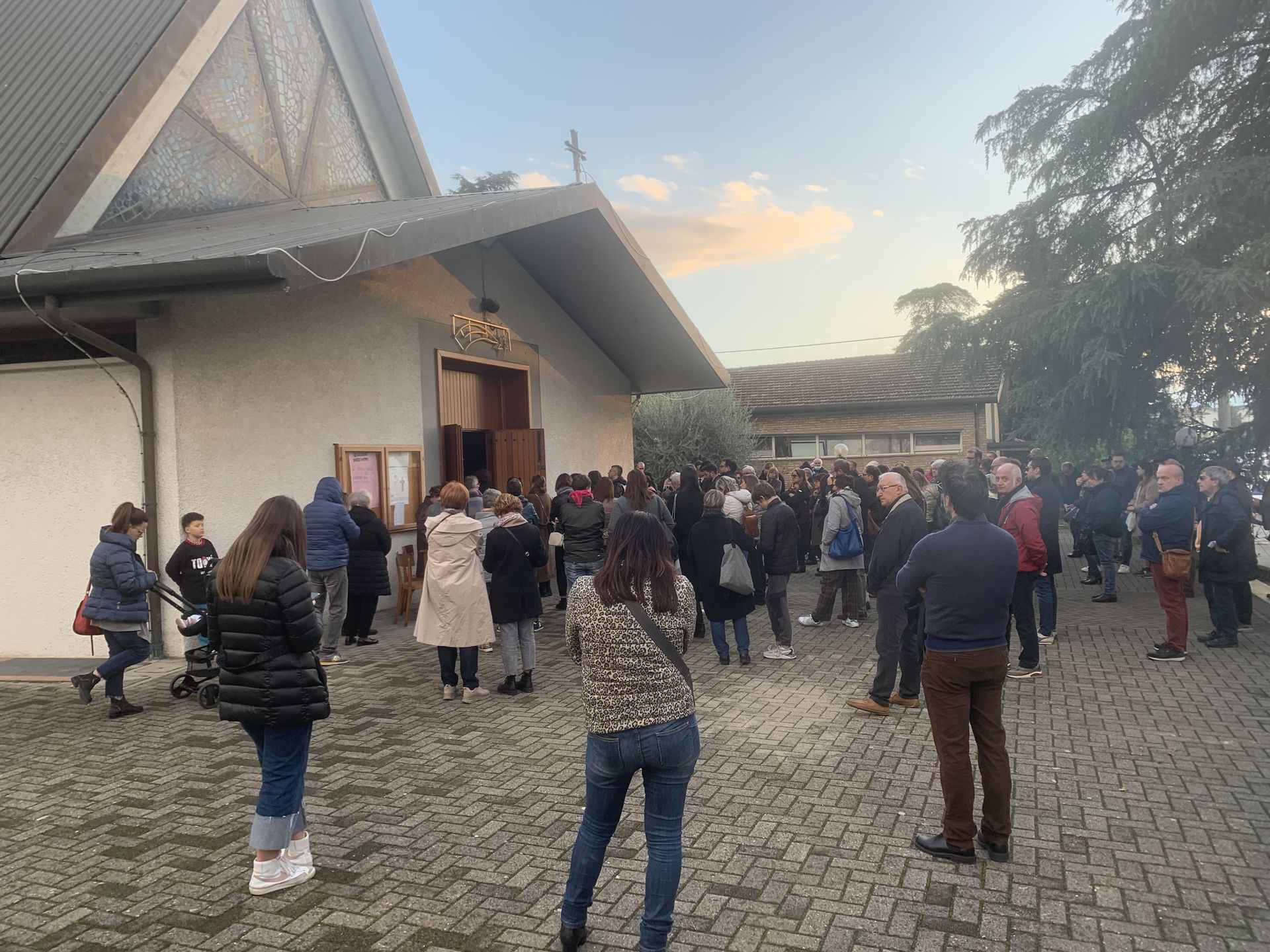 La coppia è notissima in parrocchia e in ambito Azione cattolica. Luca è il presidente parrocchiale di Ac. Oggi, per il funerale, la chiesa non è riuscita a contenere le tante persone accorse per fare sentire alla famiglia tutto il calore possibile nel momento del distacco terreno. Molti fedeli, diversi provenienti da Ravenna, città di origine di Luca, sono stati costretti a partecipare alla Messa dal sagrato della chiesa o dal salone nel seminterrato. Tutti, comunque, hanno potuto seguire la liturgia.