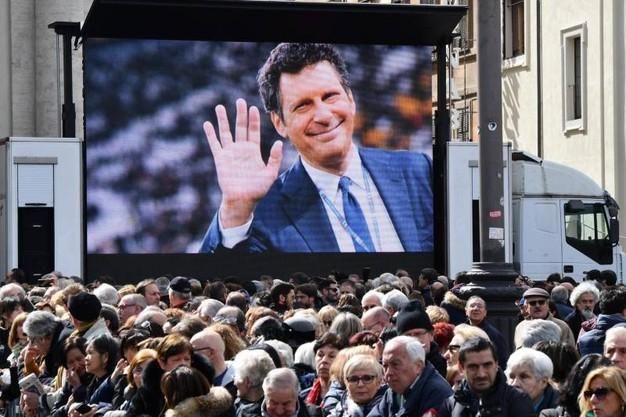 “La nostra vita sia un canto di lode alla tua bellezza e le nostre opere i raggi luminosi che illuminano le strade degli uomini. Donaci il tuo perdono e la tua benevolenza, donaci il tuo Spirito di sapienza e di bellezza, ispiraci con il tuo amore e la tua grazia, e donaci ali stupende affinché con l’arte ci innalziamo fino a te”: è un passaggio dell’intensa preghiera degli artisti letta a conclusione del rito funebre da Antonella Clerici e Carlo Conti. “Un piccolo grazie a lui che ringraziava sempre tutti”: con queste parole un commosso Flavio Insinna dà lettura della splendida poesia “Amicizia” di Jorge Luis Borges. “Credo che dall’alto con il suo sorriso ci guardi e ci accompagni”, le ultime parole di don Insero, seguite da uno scrosciante applauso mentre la bara portata a spalla dagli amici si dirige verso l’uscita .