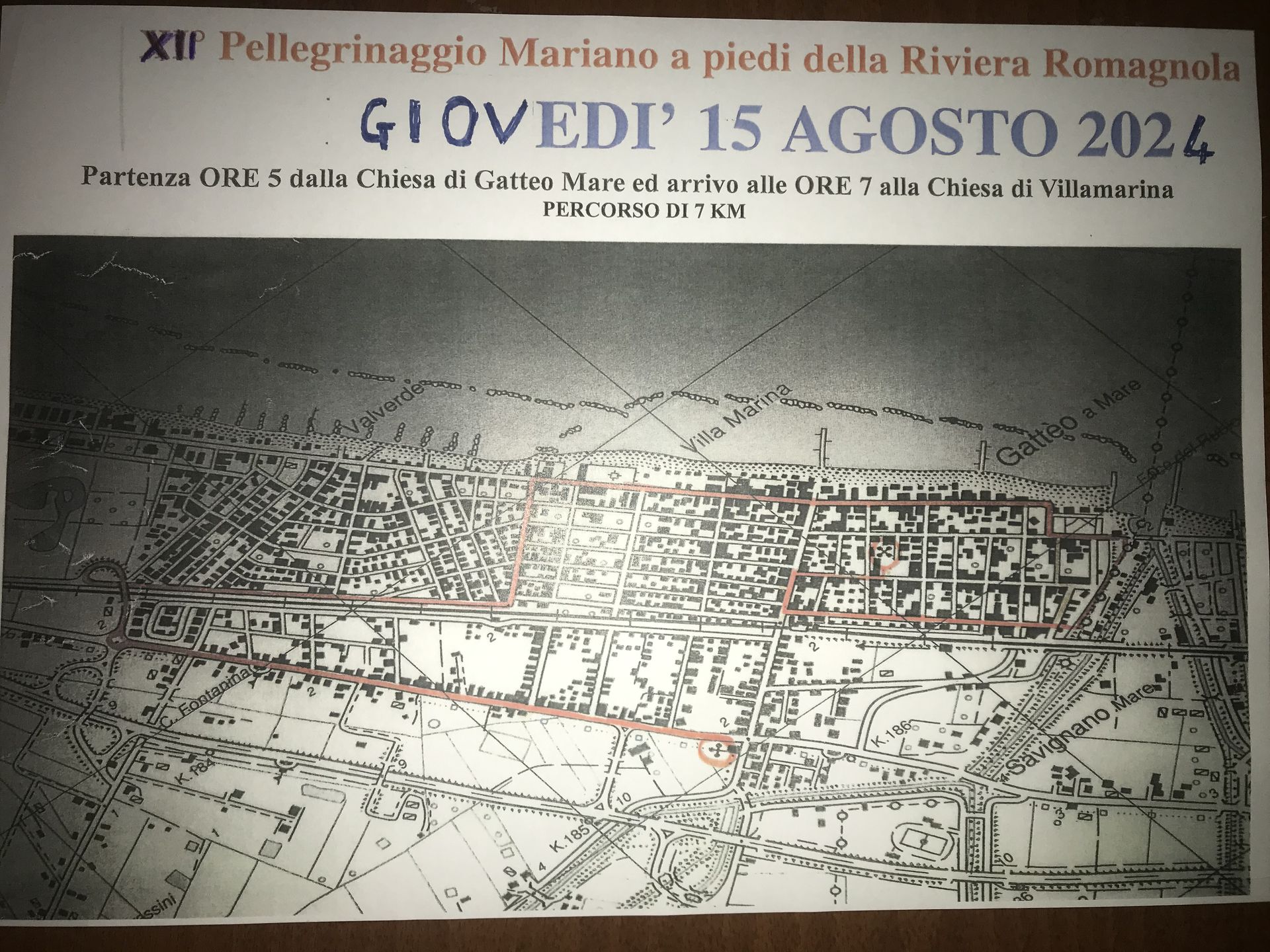 La parrocchia dell’Annunciazione in Villamarina-Gatteo Mare propone per giovedì 15 agosto il XII “Pellegrinaggio mariano a piedi della Riviera romagnola”. Ne dà notizia il parroco don Mirco Bianchi.Di seguito il programma della mattina. Il ritrovo è alle 4,45 davanti alla chiesa parrocchiale, in piazza della Libertà, a Gatteo mare.