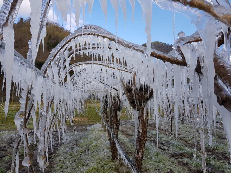 Gli imprenditori più professionali hanno attivato l’impianti di irrigazione antibrina già nella serata di lunedì. Irrigando abbondantemente, il passaggio di stato dell’acqua da liquido a solido genera calore e questo permette alle gemme di salvarsi, come mostrano le foto pubblicate.