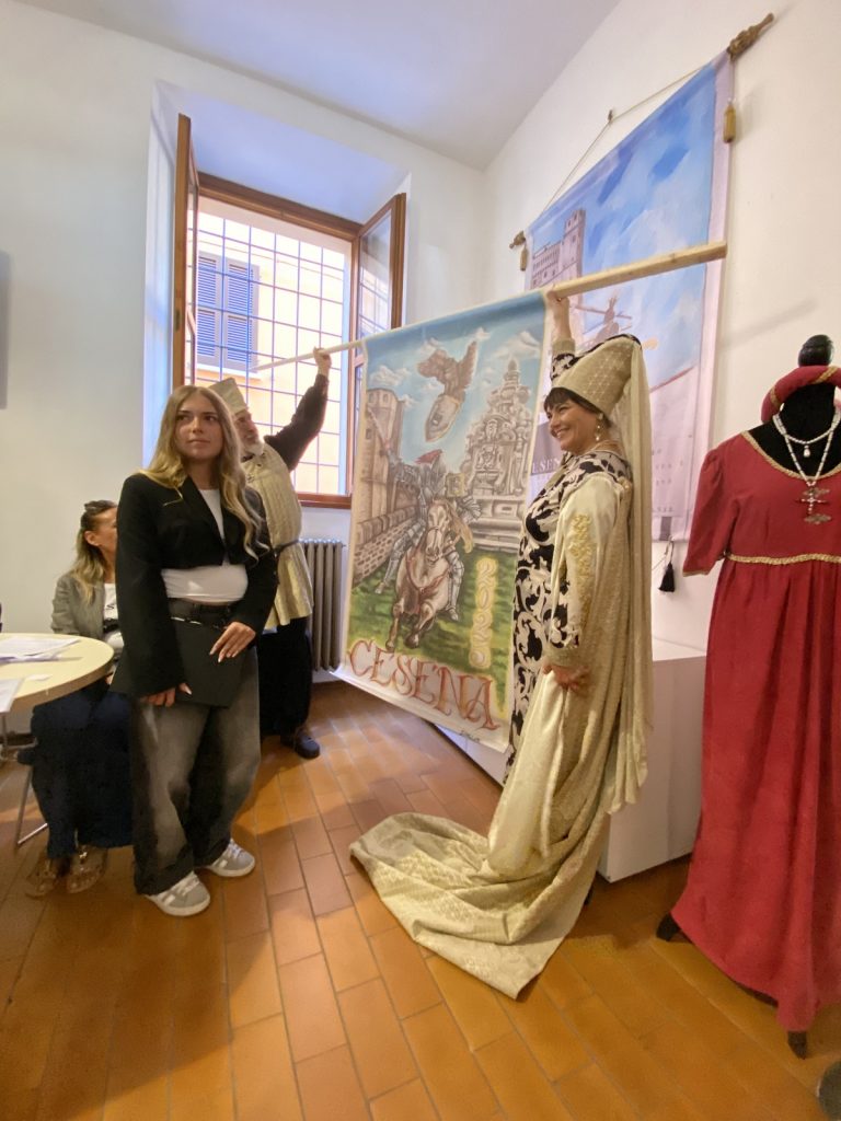 Giostra di Cesena 2025, svelato il palio e effettuati gli abbinamenti tra i cavalieri e i quartieri da rappresentare. È successo tutto poco fa nella sede dell’associazione Giostra di Cesena che si trova in piazza Aguselli. Il palio che si vede nella foto qui sotto è stato dipinto da Iselin Romboli, 16 anni, studentessa al liceo artistico “Canova” di Forlì. L’opera, eseguita con la tecnica dell’acrilico su tela, reca simbolismi che dicono di un legame tra la città e questo evento storico istituzionalizzato nel 1465 e celebrato fino al 1838. Una composizione, come si legge nelle note a margine della conferenza, “che unisce tradizione e contemporaneità, trasformando l’arte in veicolo di memoria e identità”. Iselin non è nuova a certe imprese. Nel 2022 ha vinto un concorso nazionale, “Un poster per la pace”, promosso dal Lions club, quando ancora era studente alla scuole medie.