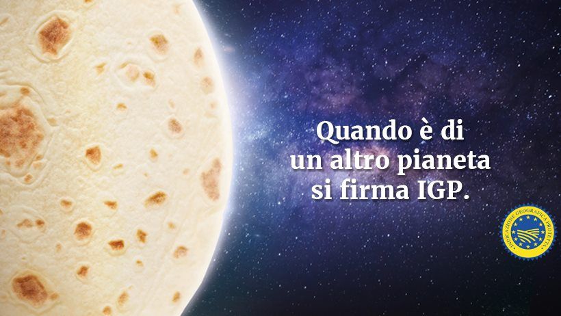 La Piadina romagnola Igp sale nello spazio, anzi sostituisce il disco lunare, e le sue bolle, segno di una perfetta cottura, diventano gli antichi crateri.
