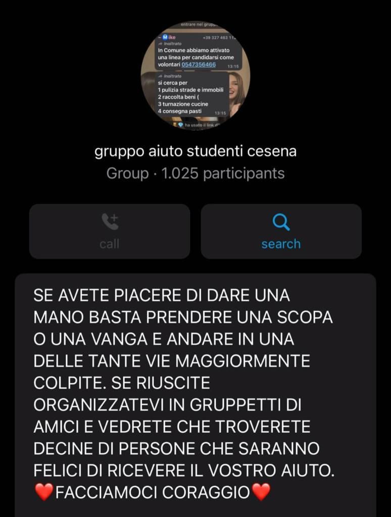 È nato un gruppo Whatsapp “Aiuto studenti Cesena”. Le studentesse e gli studenti delle scuole superiori di Cesena si sono già mobilitati per cercare di dare il loro contributo e aiutare le famiglie colpite dall’alluvione dei giorni scorsi.