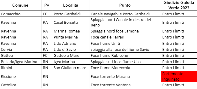 Presentati nei giorni scorsi a Cesenatico da Goletta Verde di Legambiente i risultati del monitoraggio delle acque delle coste dell’Emilia-Romagna. Su 11 punti campionati solo uno è risultato essere oltre i limiti di legge. Si tratta della foce del torrente Marano nel comune di Riccione.