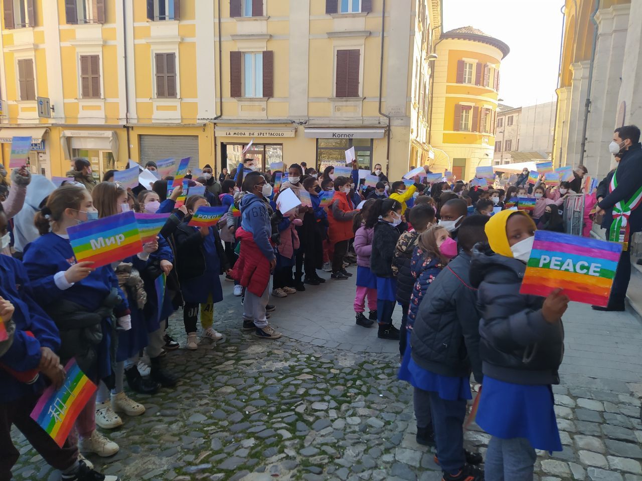 Stamane le 10 classi della scuola primaria Carducci si sono riversate in piazza del Popolo a Cesena per chiedere a gran voce la pace. Lo aveva chiesto ieri anche il presidente ucraino Volodymyr Zelensky a tutto il mondo di scendere in piazza il 24 marzo, a un mese esatto dall’inizio della guerra con l’invasione russa del 24 febbraio.