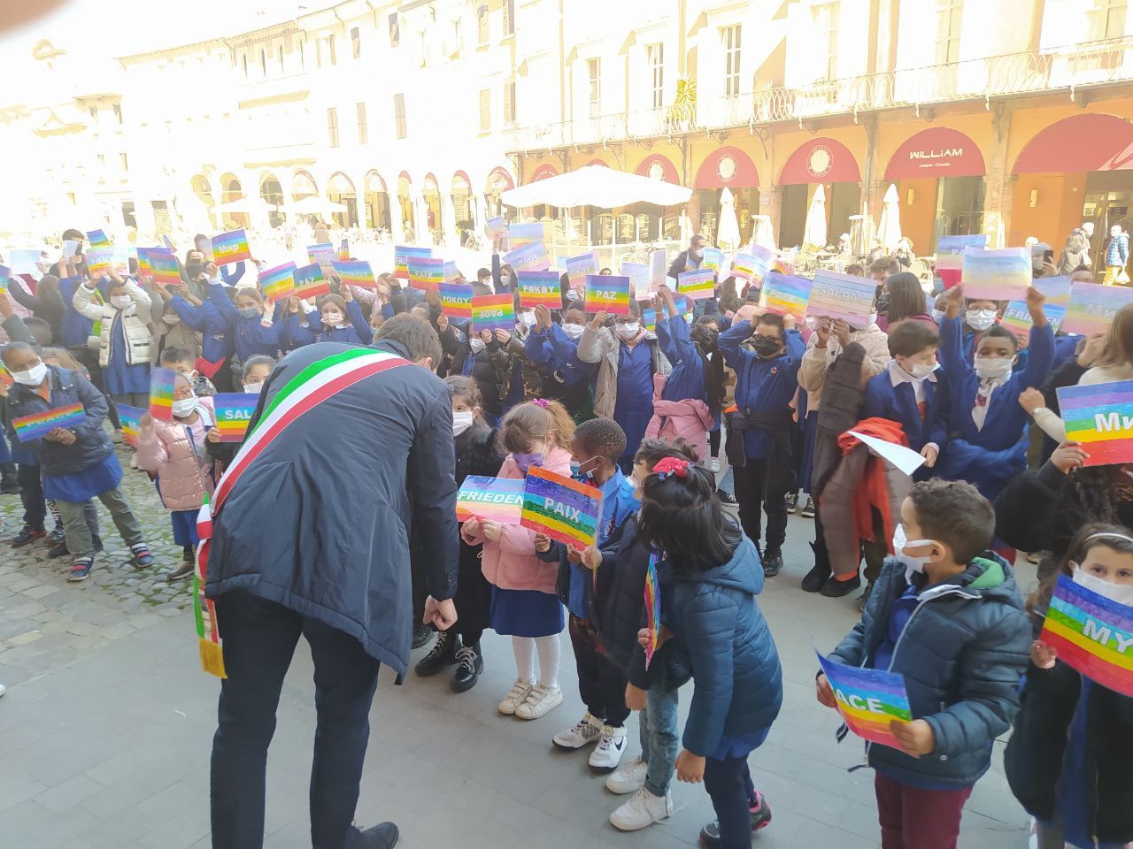 Coincidenza o scelta, poco importa. I bambini, con le loro bandiere colorate e le scritte in tutte le lingue possibili, pace, freedom, myr, salam, peace, paix, pokoy, paz e tante altre, hanno sbandierato e chiesto a gran voce la pace. Ad ascoltarli, oltre alla gente di passaggio in piazza, il sindaco Enzo Lattuca che li ha salutati e li ha ringraziati.