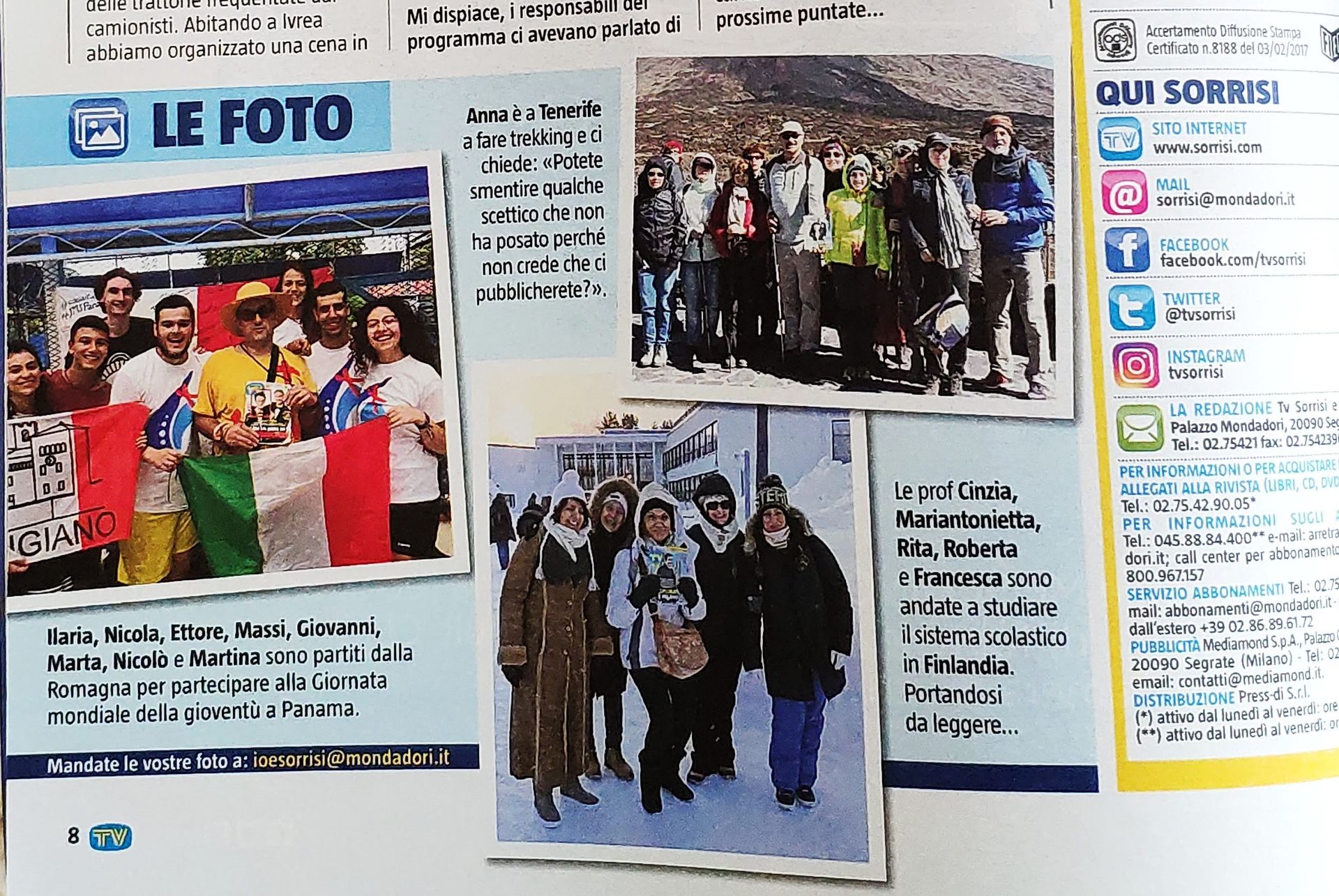 Nel numero di TV Sorrisi e Canzoni di questa settimana (4/2019), nella pagina dedicata alla “Posta dei lettori”, è pubblicata una foto dei nostri giovani (assieme ad altri compagni di viaggio romagnoli) “partiti dalla Romagna per partecipare alla Giornata mondiale della gioventù a Panama”.