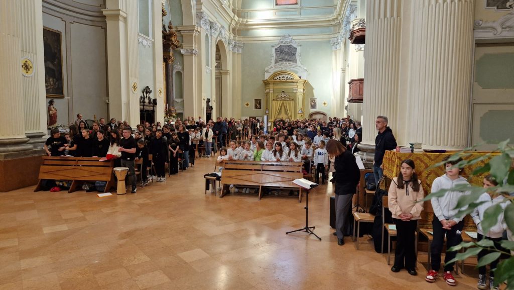 È arrivato poi il momento delle consegne: «Ora vi do i compiti per casa! Ogni giorno, dovete imparare a dire a mamma, papà, fratelli, sorelle e nonni: grazie. Quando siamo disobbedienti e ce ne accorgiamo, cominciamo a dire: scusa. E infine, quando un amico è rimasto indietro, dire: ti aspetto, camminiamo insieme. Mi raccomando, genitori, voglio vedere se fanno i compiti. Così costruirete la pace, sono i compiti più difficili. Ma se li faremo bene prenderemo il voto più alto, che supera persino il 10. E ora ringraziamo tutti Gesù che è la nostra pace».
