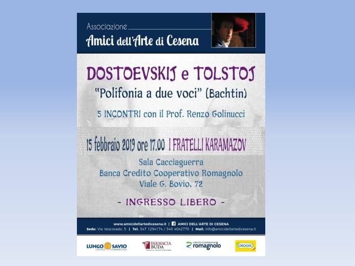 Oggi, venerdì 15 febbraio alle 17 presso la sala Cacciaguerra della Banca di Credito Romagnolo, in viale Bovio 76/80 a Cesena, si terrà il terzo incontro del ciclo “Dostoevskij e Tolstoj. Polifonia a due voci (Bachtin)”  con il professor Renzo Golinucci.