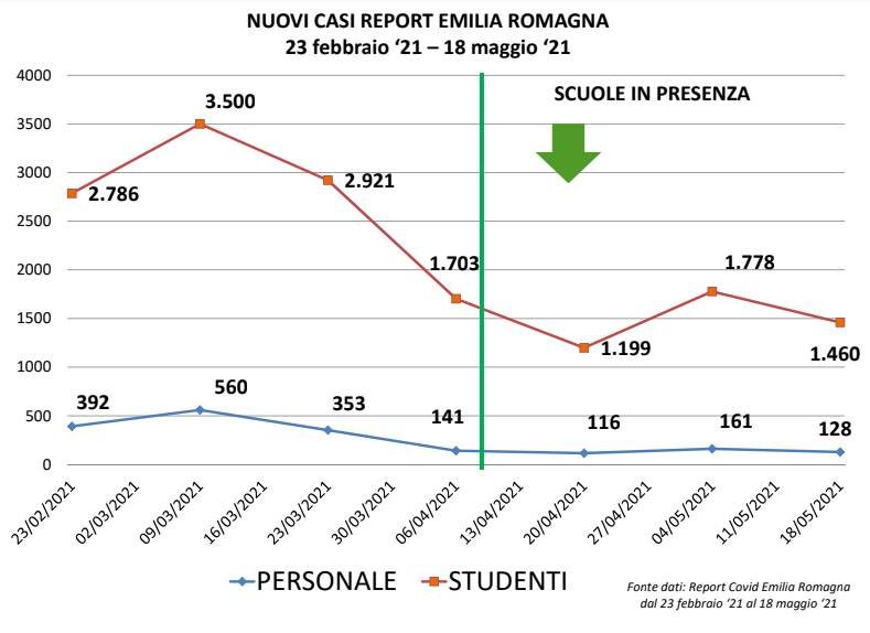 “Sono state mandate negli ultimi due mesi richieste di spiegazione ad assessori, Ufficio scuola regionale, Direzioni scolastiche per l’utilizzo di percentuali di Dad così elevate nonostante il Decreto Draghi consentisse una maggior frequenza scolastica, ma non ci è stata mai data alcuna risposta – affermano i genitori del comitato “Ragazzi a scuola Forlì-Cesena” -. Eppure una risposta la troviamo proprio nei dati dei Report pubblicati dalla Regione stessa: in quello di martedì 18 maggio, ad esempio, i nuovi casi di positività in fascia 0-18 anni sono letteralmente crollati (30 per cento in meno, 1.460 contro 2.921 di metà marzo), confermando il trend migliorativo dell’ultimo periodo. Da quando le scuole sono state aperte dopo Pasqua i dati mostrano chiaramente che andando a lezione in aula, i nuovi casi sono drasticamente diminuiti rispetto al periodo precedente in cui – pur stando a casa – i ragazzi si sono contagiati più del doppio rispetto oggi. Ci chiediamo perché a fine aprile la Regione sostenesse il contrario”.