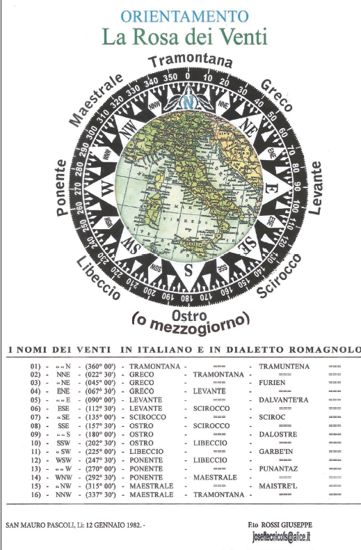I nomi dei venti in dialetto romagnolo. L’dea è di Giuseppe Rossi di San Mauro Pascoli, appassionato di navigazione che ha realizzato una cartina dell’Italia con la raffigurazione della Rosa dei Venti circostanziata con l’orientamento della loro provenienza e la denominazione, sia in italiano che in dialetto romagnolo, come si può vedere dall’immagine.