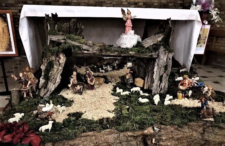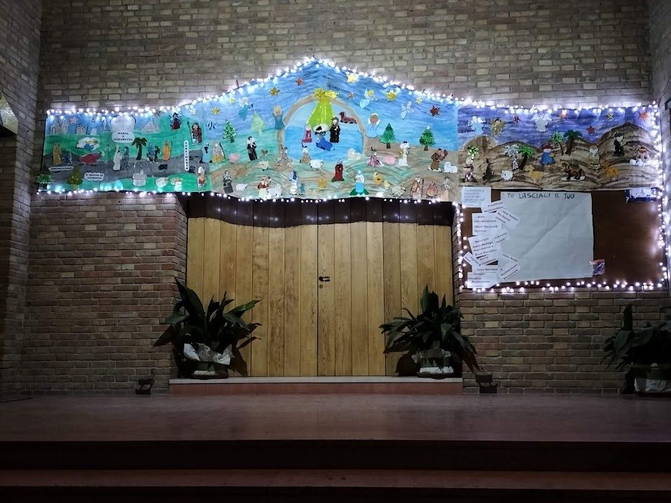Nella foto in alto il presepe che si trova sulla porta della chiesa di Bagnarola. È stato realizzato con l’apporto di tutti i bambini del catechismo.
