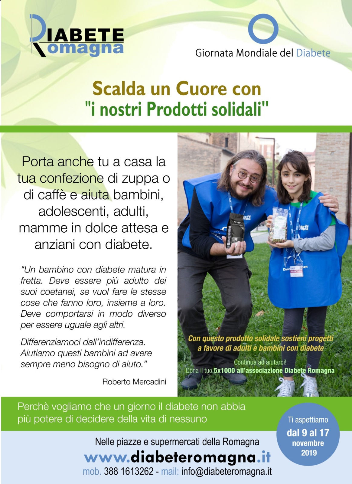 I volontari dell’associazione offriranno materiale informativo sul diabete e sulla sua gestione e racconteranno i progetti dell’associazione volti a migliorare la qualità di vita dei pazienti e delle loro famiglie. Per tutti sarà possibile offrire un contributo a questa importante causa, il diabete in Romagna colpisce circa 78.000 persone, e in cambio della donazione i volontari offriranno un prodotto solidale.