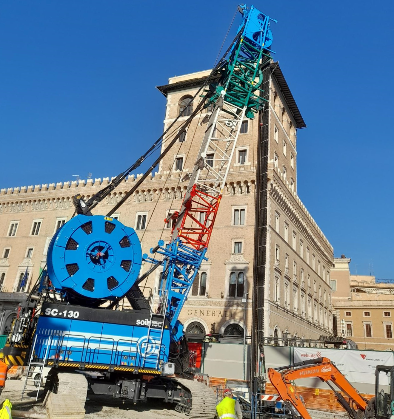 In questi giorni, nel cuore di Roma, spicca la sagoma imponente di una macchina blu con traliccio tricolore. Si tratta dell’idrofresa Soilmec di ultima generazione destinata a scavare fino alla profondità di 85 metri tutti i muri perimetrali della nuova archeo-stazione della Metro C di piazza Venezia.