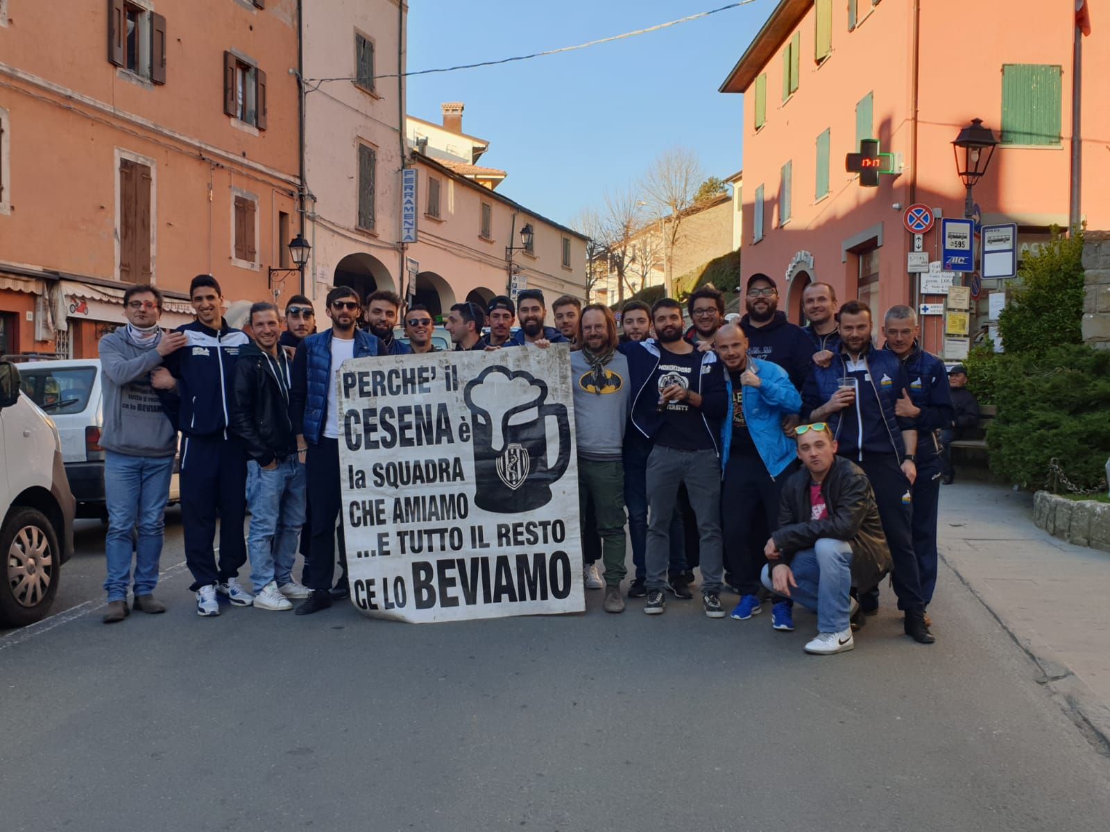 Ma come è nato questo ideale “gemellaggio”? Galeotto fu uno striscione e un cesenate emigrato, Roberto Savini. Tifoso del Cesena da sempre, Savini appese qualche tempo fa nel bar centrale di Monghidoro una foto di uno striscione della Curva mare “Perché il Cesena è la squadra che amiamo e tutto il resto ce lo beviamo”. Un simpatico slogan che è entrato nell’immaginario collettivo degli avventori.