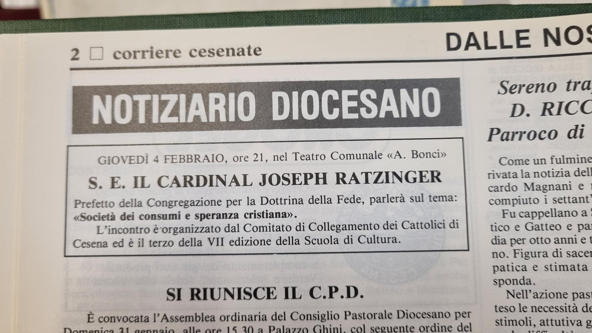 L’incontro fu promosso dal Comitato di Collegamento dei Cattolici, organismo che riuniva le espressioni del laicato diocesano, e dalla commissione diocesana per la cultura. Il Corriere Cesenate ne pubblicò un resoconto a cura del professor Stefano Salvi nell’edizione del 13 febbraio 1988 (il giornale costava 800 lire). Nella foto la prima pagina di allora, con la fotografia di Gian Angelo Sirotti in cui si riconoscono, accanto al cardinale Ratzinger, monsignor Walter Amaducci, Arturo Alberti, il vescovo Luigi Amaducci e don Piero Altieri.