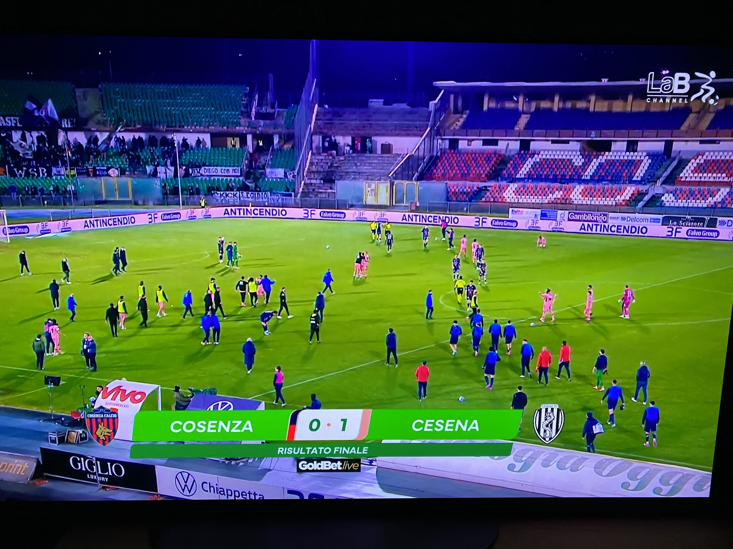 Certi gesti col calcio non hanno nulla a che fare. E pazienza se il Cesena vince per la prima volta nella storia in quel di Cosenza, ma la precedenza ce l’hanno le due interruzioni del gioco di circa nove minuti in totale per l’arrivo in campo di razzi esplosi da fuori dallo stadio. Il clima è surreale con l’impianto deserto nel momento dell’ingresso delle squadre per i saluti di rito, ma i tifosi di casa, per protesta dopo la retrocessione, hanno concluso nel peggiore dei modi la loro stagione casalinga. Passano circa 90 secondi e piovono almeno tre razzi in campo, con le squadre pronte a rintanarsi nei pressi delle panchine e l’arbitro Prontera di Bologna al telefono per capire il da farsi. Arriva il via libera dopo cinque minuti assurdi, superato l’iniziale spavento la gara ricomincia. Al 12’ sugli sviluppi di un corner, è Bastoni a risolvere in rete un flipper per il gol che poi decreterà la vittoria al Cavalluccio. I bianconeri cercano di chiudere subito la gara, Shpendi non aggancia il suggerimento a centro area di Ceesay e rinvia ancora l’appuntamento col gol. Superata anche la seconda interruzione di quattro minuti per l’arrivo di altro materiale pirotecnico sul terreno di gioco, ancora Ceesay scalda il destro potente che va sul fondo. Rispondono i Lupi con il diagonale di Artistico svenato da Klinsmann con le punte delle dita.