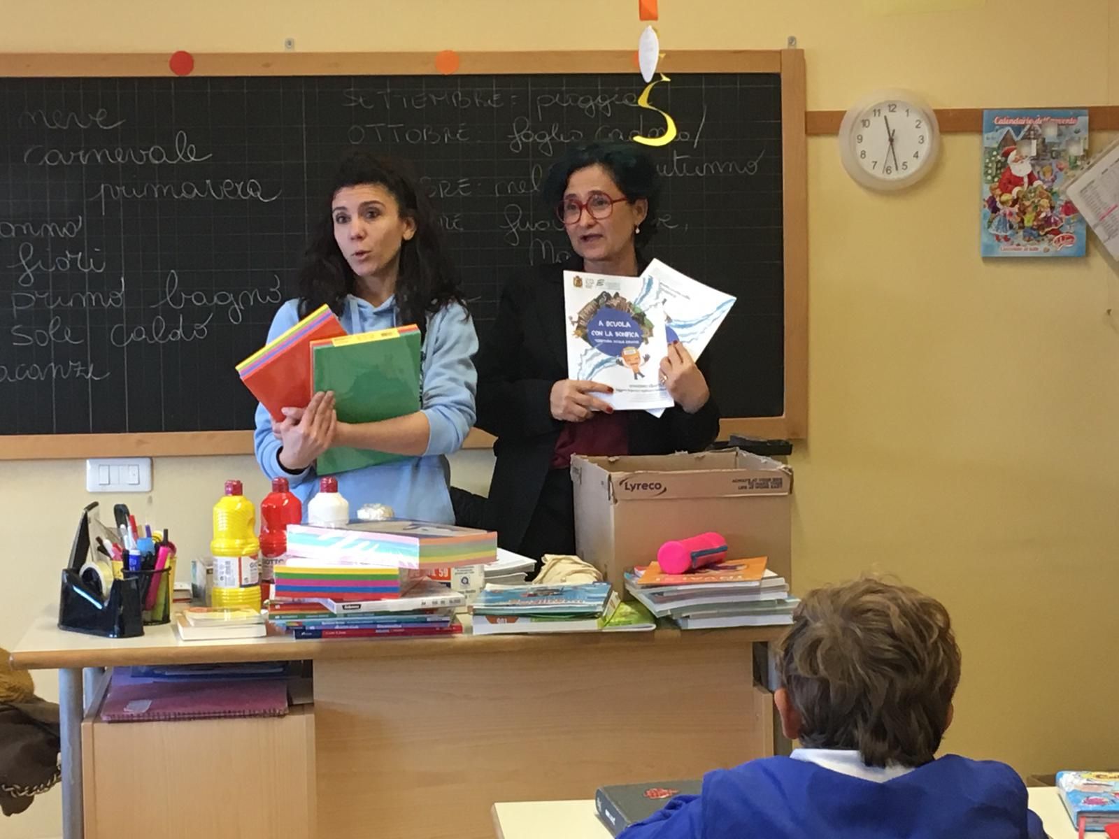 L’incontro nella V A è stata un’occasione per ripassare gli importanti concetti trasmessi ai ragazzi lo scorso anno scolastico, ma anche un momento di gioia per la consegna di un quaderno didattico progettato e realizzato da Laura Prometti (consorzio di Bonifica) e Sara Segati (Cestha), di colori, pennelli, cartoncini colorati e materiale vario per realizzare, anche quest’anno, un elaborato per il concorso regionale Acqua&Territorio, che abbia nuovamente l’acqua e le attività del Consorzio di bonifica come protagonista.