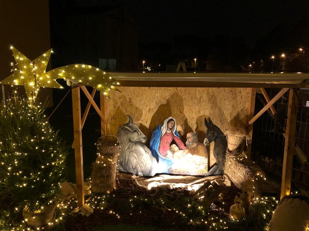 Da sabato scorso è stata allestita una grande capanna con una bella rappresentazione della Natività del pittore Adriano Maraldi all’angolo fra via don Minzoni e via Pascoli, che si accende di luci sul far della sera.