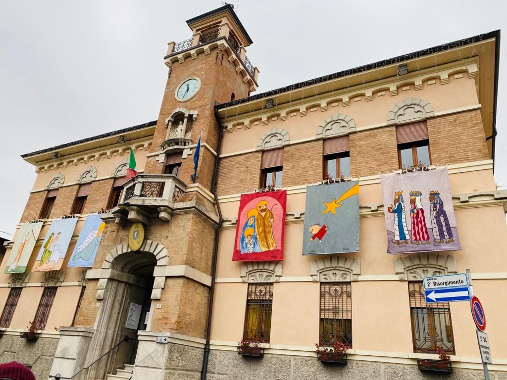 Un grande e significativo lavoro artigianale esposto dalle finestre alte del Municipio di Gambettola.