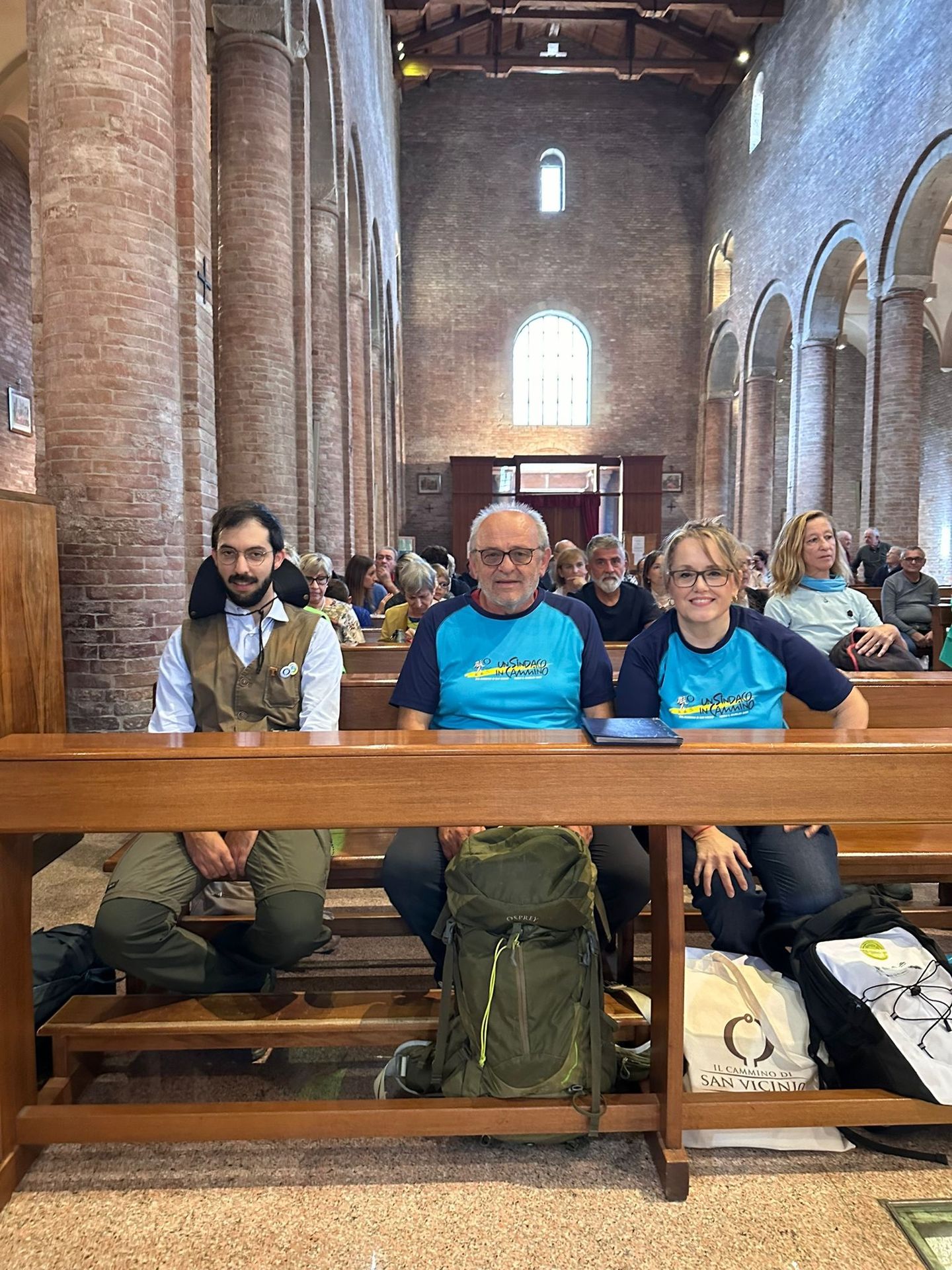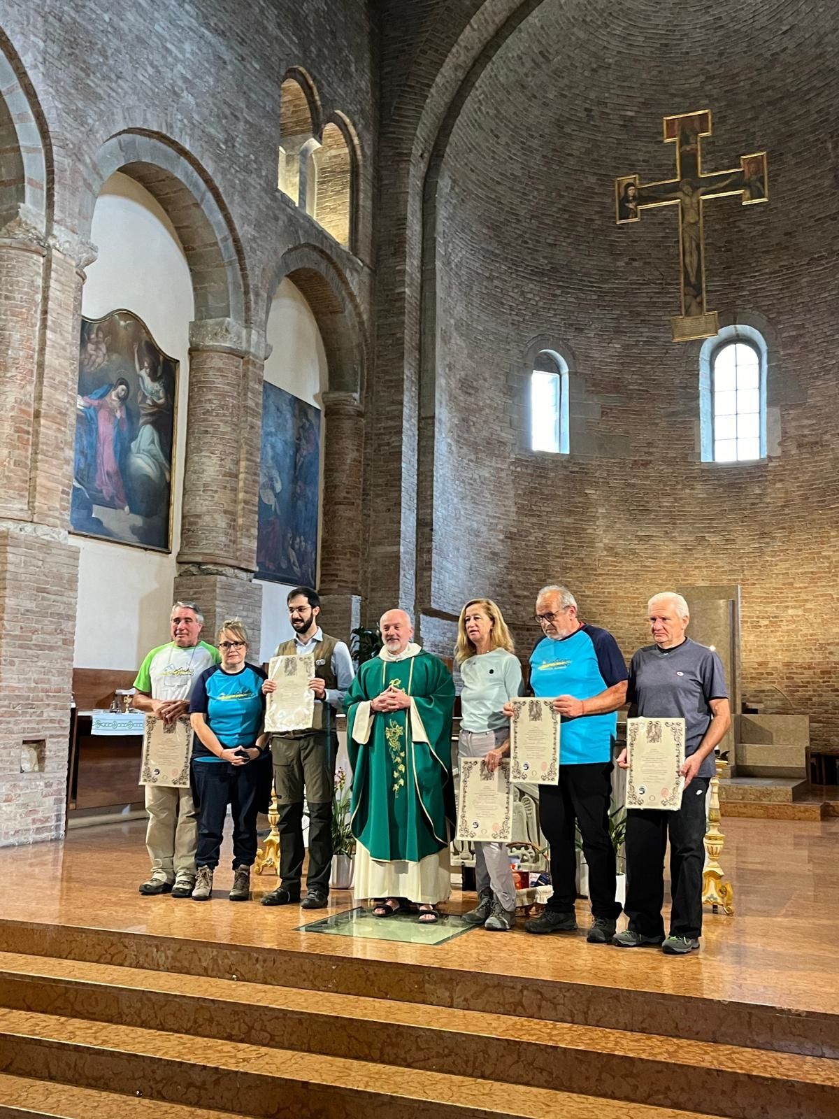 Infine la consegna del testimonium a Cangini e ai suoi compagni di Cammino e a coloro che con Cangini hanno percorso più di 100 chilometri, cinque in tutto, sindaco compreso. al termine della Messa celebrata dal parroco don Rudy Tonelli.