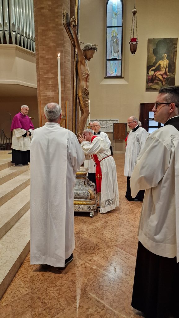 La Chiesa, per antichissima tradizione, oggi, giorno di digiuno, non celebra l’Eucaristia. L’azione liturgica inizia con la preghiera silenziosa. Il vescovo, che presiede la solenne funzione, si sdraia al suolo e tutti si mettono in ginocchio. Segue la liturgia della Parola con la lettura del Passio, il Vangelo della passione, e l’omelia di monsignor Caiazzo.